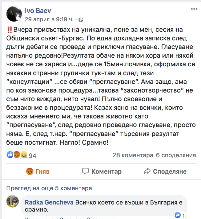 При абсолютно погазване на закона и правилата, докладната записка е подложена на ново, второ гласуване. Това автоматично превръща взетото решение в незаконосъобразно, въпреки че предложенията са приети с 40 гласа „ЗА“ при втория опит. Странно как за няколко минути в специално определената пауза общинските съветници са били принудени да си променят мнението и съответно волята на 180°. Ето и пост в социалната мрежа, който общинският съветник Иво Баев е споделил за скандалната сесия и “гласуването до дупка”, за да бъде удовлетворен хатъра на Доган.