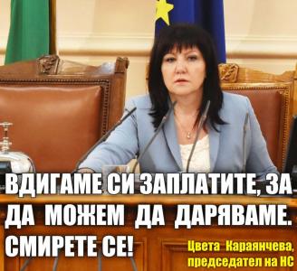 В типичния си арогантен и циничен стил, вчера тя заяви в свое телевизионно участие пред българския народ, че е популизъм да бъдат замразявани депутатските заплати, защото с 1/3 от тях ГЕРБ правят дарения в районите, от които са избрани. С абсурдно наглото си изкаване Цвета Караянчева заяви в прав текст, че с парите на данъкоплатците ГЕРБ си правят пиар, с което й подсказа, че възнаграждението им или е прекалено високо, или от ГЕРБ имат предостатъчно допълнителни, странични доходи.