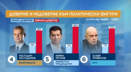 Българите имат по-голямо доверие на лидерът на „Възраждане“ Костадин Костадинов (19%), отколкото към премиера Кирил Петков (17%).