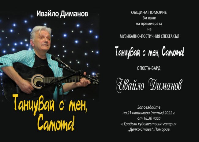 Знаков поет с китара ще се срещне с публиката на Поморие в месеца на поезията и музиката. Журналистът, поет и бард Ивайло Диманов ще закрие своето турне в Югоизточна България с музикално-поетичния си спектакъл „Танцувай с мен, Самота!“.