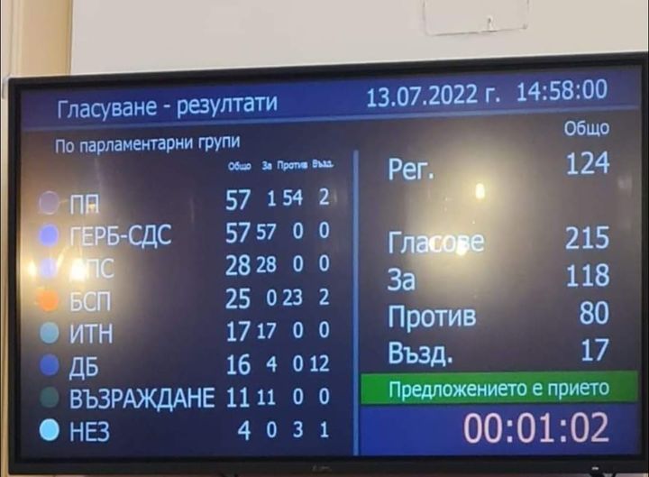 С гласовете на ГЕРБ, ДПС, ИТН и Възраждане предложението на ГЕРБ за създаването на Комисия "Лукойл" за горивата бе прието.
