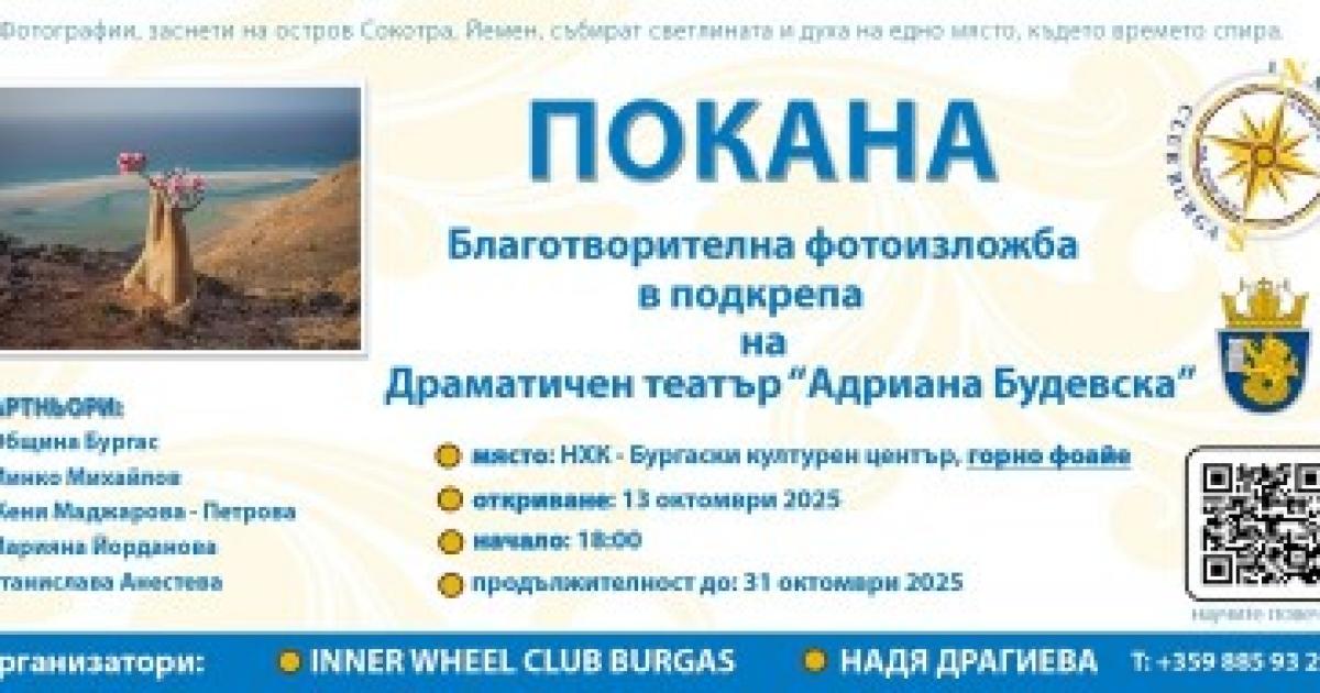Благотворителна фотоизложба в помощ на бургаския драматичен театър „Адриана Будевска“ организират дамите от Inner Wheel Club Burgas. Тя ще бъде открита на 13 октомври 2025 г. (понеделник) от 18 часа във фоайето на втория етаж в НХК-Бургас
