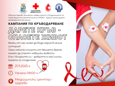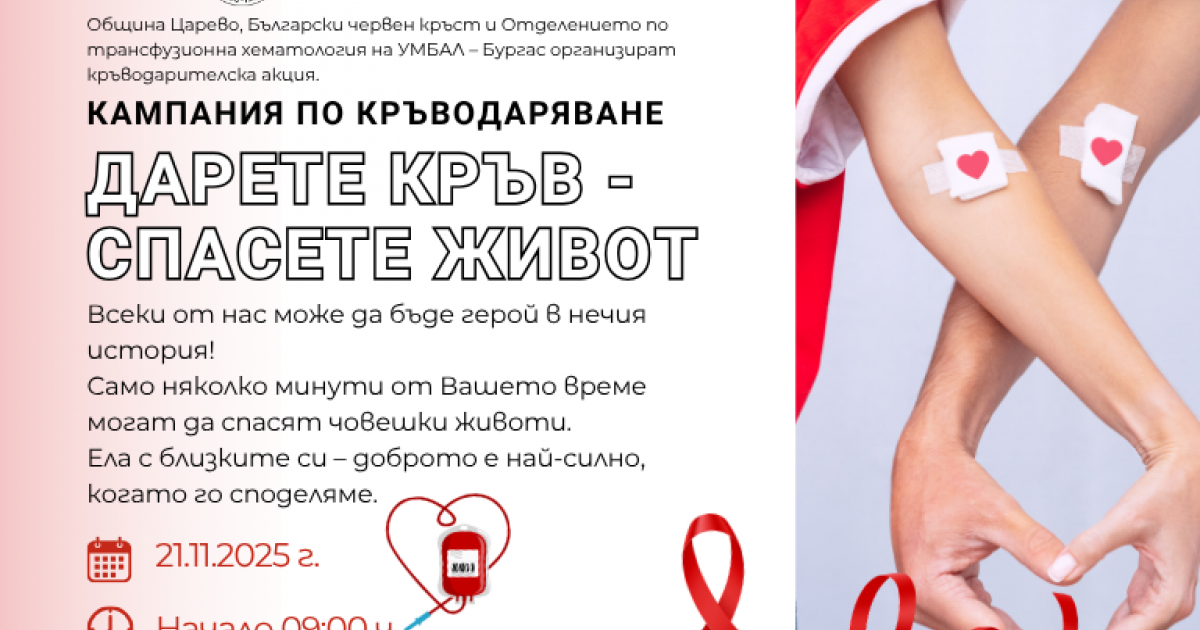 На 21 ноември 2025 г., петък от 09:00 ч., в сградата на Общински медицински център – Царево ще се проведе втората за годината кръводарителска акция
