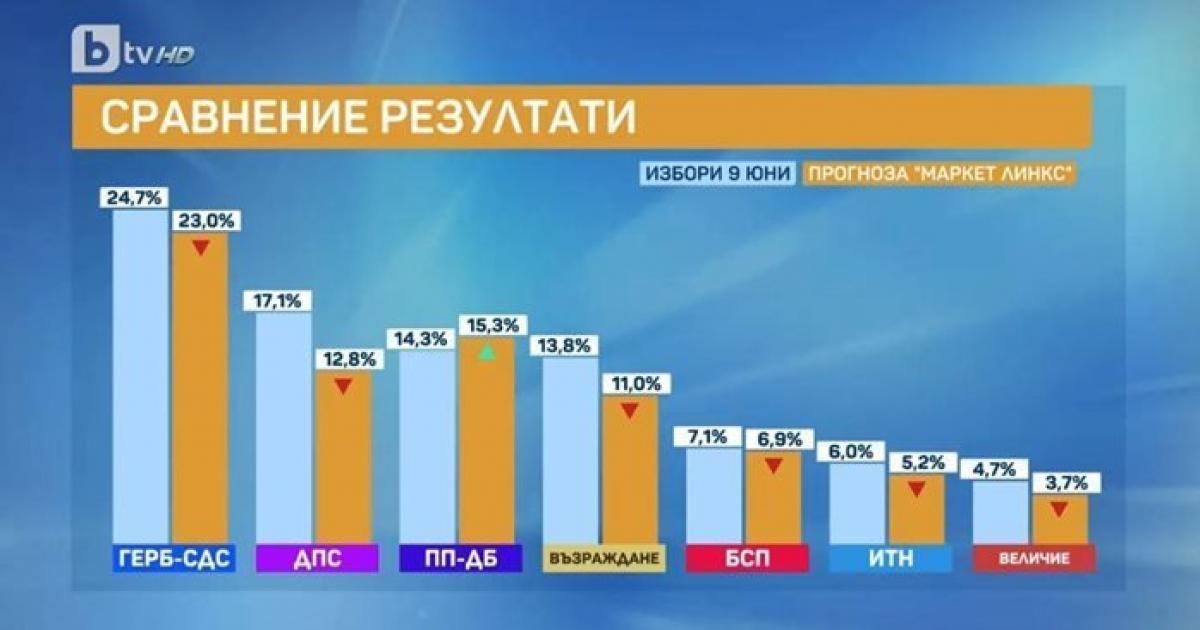 Ако изборите бяха сега, резултатите биха изглеждали така - ГЕРБ биха взели 23% от гласовете, ПП-ДБ - 15.3%, ДПС - 12.8%, Възраждане - 11%, БСП - 6.9%, ИТН - 3.3%. "Величие" остават под бариерата за влизане в парламента с 3.7%.